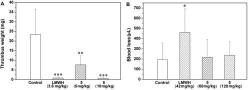 图3. 纯化九糖(化合物5)对下腔静脉血栓形成(A)及出血倾向(B)的影响