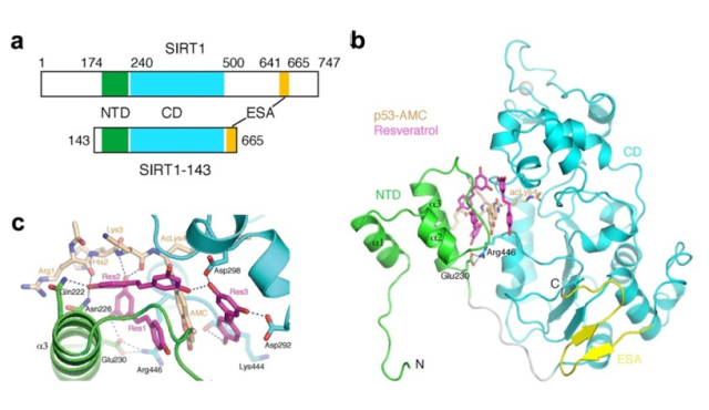 生物物理所许瑞明研究组解析了SIRT1“全酶”(包括N端调节区域、催化核心结构域及C端调节区域)与三个白藜芦醇小分子以及AMC荧光标记的p53小肽三元复合物的晶体结构,并且通过突变体实验、结合实验和活性实验确定了三个白藜芦醇小分子的重要性及作用机制。对整个激活过程最为重要的两个白藜芦醇小分子一方面与底物p53小肽的AMC荧光环相互作用,另一方面与SIRT1的N端调节区域相互作用,从而使蛋白与底物之间的结合更为紧密。然而对于没有AMC荧光修饰的天然小肽,白藜芦醇则不能促进SIRT1的去乙酰化酶活性。