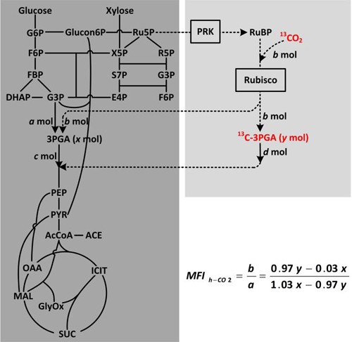 图:在大肠杆菌中心代谢途径的基础上构建一条固定CO2的支路。异养固碳的代谢通量指数(Metabolic flux index of heterotrophic CO2 fixation, MFIh-CO2)是指CO2支路的代谢通量占中心碳代谢途径通量的百分比。
