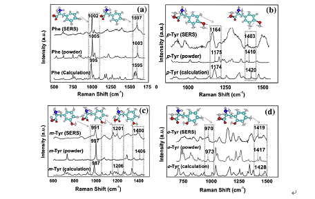 以研究电离辐射引起苯丙氨酸(Phe)氧化反应为例,课题组利用SERS技术检测了苯丙氨酸转化为三种酪氨酸异构体(o-Tyr,m-Tyr,p-Tyr)的氧化反应,并根据光谱理论模拟计算,确定了苯丙氨酸和各种酪氨酸异构体的特征峰,从而对离子辐射条件下苯丙氨酸向酪氨酸转变、并随辐射作用时间氧化增加过程进行了定量分析和研究。该成果已发表于Journal of Molecular Structure(2014, 1072,195–202)。