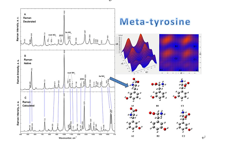 对于生物分子振动光谱理论计算,课题组比较多种理论模型的计算,得出SMD溶剂模型和色散修正对氨基酸分子的结构参数计算和光谱计算的精度有明显的提升。以间位-酪氨酸(m-Tyr)为例,系统研究了其拉曼和红外光谱,并借助同位素拉曼光谱实验和理论计算数据对比解析它的振动模式。相关成果发表于国际光谱学专业期刊Spectrochimica Acta Part A: Molecular and Biomolecular Spectroscopy(2015, 151, 111–123)。
