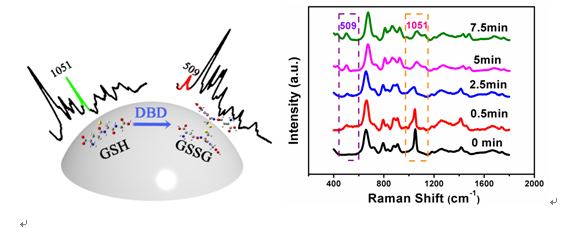在以上工作基础上,课题组利用SERS技术对一种生物体内普遍存在的生物分子谷胱甘肽(glutathione)在电离辐射条件下的氧化还原反应进行定量分析和研究。研究中,用环糊精做还原剂和稳定剂制备了SERS活性好、背景干扰小且形状大小均一的银纳米颗粒,由此对微量还原型谷胱甘肽(GSH)和氧化型谷胱甘肽(GSSG)进行了SERS检测和分析,发现可以通过509cm-1(S-S)与1051cm-1(C-N)这两个拉曼谱相对强度比值作为由GSH向GSSG转变的度量指标。该项工作不仅解决了SERS技术对微量生物分子反应体系所涉及混合物的定量分析,而且提出一种新的考量生物辐射损伤的检测方法,为下一步在活体细胞中实现对生物应激辐射氧化胁迫反应或辐射损伤进行快速、无损、定量评估打下基础。相关成果发表于RSC Advances ( 2015, 5, 57847–57852)。