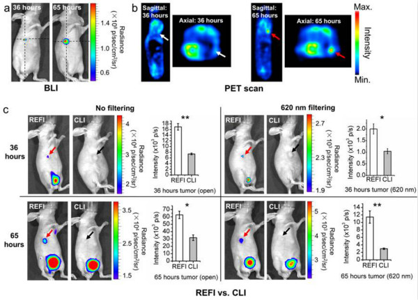 通过对比不同成像模态的成像效果,REFI的高灵敏度肿瘤探测效果展露无疑。图中对于肿瘤生长了36小时(直径不足2mm)和65小时(直径约5mm)的同一批乳腺癌原位裸鼠模型(图a)进行多模态对比成像实验。其中PET成像只能探测到肿瘤生长65小时后的病灶(图b);常规契伦科夫荧光成像(CLI)在两次实验中皆没有探测到肿瘤的位置(图c,CLI);而光学-核素融合的REFI成功探测到了36小时与65小时两个时间段的肿瘤位置(图c,REFI)。