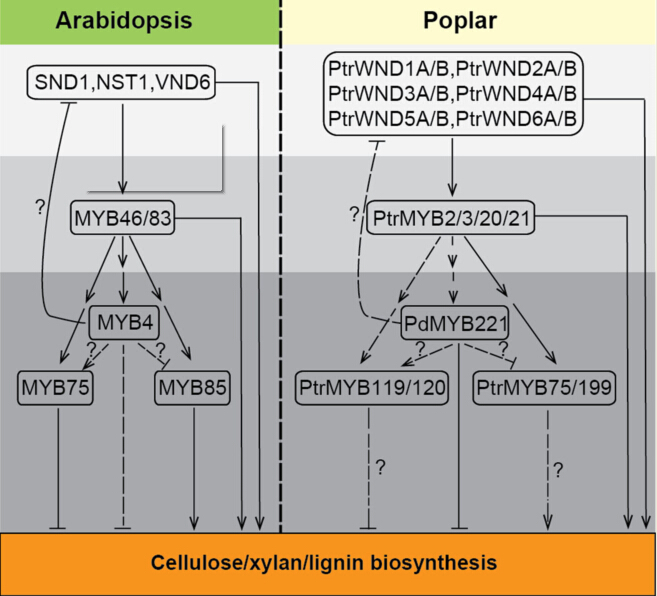 拟南芥和杨树次生细胞壁形成的分子调控网络(部分):木材的形成受一个复杂网络的调控,PdMYB221 转录因子处在这个级联调控网络的下游,能够直接抑制纤维素、半纤维素和木质素合成基因的表达。