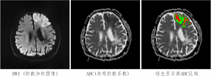 彩色区域为自动确定的缺血区域,高ADC区域占的比例达55%,病人溶栓后有好预后