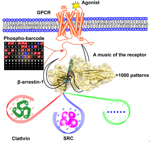 据此结果,联合小组提出了受体信号转导的笛子模型:受体的磷酸化编码产生的花样指导Arrestin的信号时,就像手指按在笛子的孔上,不同的磷酸化组合可以带来不同的手指组合,从而形成特异的音符, 指导Arrestin的多样性功能。一种1-4-6-7的音符可以激活Clathrin,从而介导受体内吞。而另一种1-5音符可以激活SRC,促进细胞的迁移等。考虑到10个磷酸化位点的组合可以带来超过1000种变化(210-1=1023),因此受体C末端不同的磷酸化花样就可以引起超过1000种Arrestin的特异性构型;受体在理论上可以通过Arrestin启动超过1000种信号途径。这个新的磷酸化编码理论可以部分解释长期以来的一个悬而未决的问题:人体内超过800个GPCR如何利用仅有的24个效应器蛋白(20个G蛋白,4个Arrestin)行使多种多样的(>10000种)细胞功能。