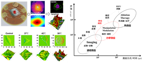 图:超声微流控芯片实现温度精确控制,从而实现药物释放引起细胞凋亡,量化研究超声热效应及机械效应(左图)以及超声的三大基本声学效应及其生物医学应用(右图)。