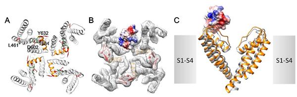 图注:(A) 在冷冻电镜结构上突变上标记对RhTx激活有影响的残基(侧链标红)。(B) RhTx与TRPV1(DkTx的激活态)的分子空间对接模型。其中RhTx标记为彩色,DkTx为红色,TRPV1为灰色。(C) TRPV1关闭态结构(灰色)与其被RhTx结合时开放态的结构之间的相互比较(橙色)。