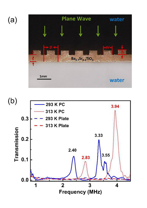 深圳先进院超声技术项目组创新性提出基于温度变化的材料与器件性能调控技术:将铁电相变材料作为温度敏感材料用于声子晶体的单元结构,该声子晶体仅通过改变环境温度,即可以实现对声波灵活的调控。该研究首次实验上设计并制备了Ba0.7Sr0.3TiO3 (BST)铁电陶瓷声子晶体结构,在室温20K的变化范围内,实现了对声波透射频率20%的偏移。该项研究为设计可调控声人工结构提供了理论支撑和实验依据,有望利用更多的智能结构和材料(如温度、力、电、磁、机械等敏感材料)设计可调控声人工结构,利用温度、力、电、磁、机械等智能化参量对声人工结构性质调控,以拓展这类材料在高端智能声学器件及生物医学超声等研究中的应用。