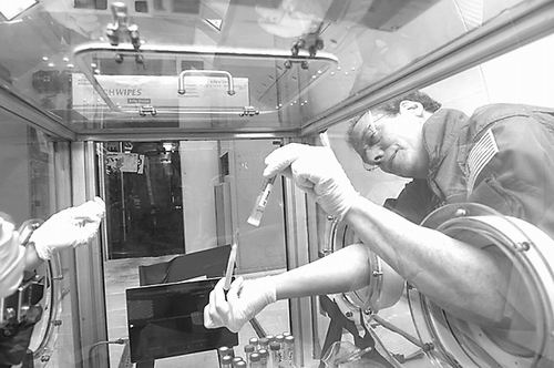 Andy Feinberg在零重力下利用容积式移液管转移液体。图片来源:NASA