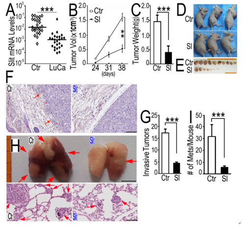 图1. SLIT蛋白过表达能够抑制肺癌细胞的局部侵袭及肺癌转移