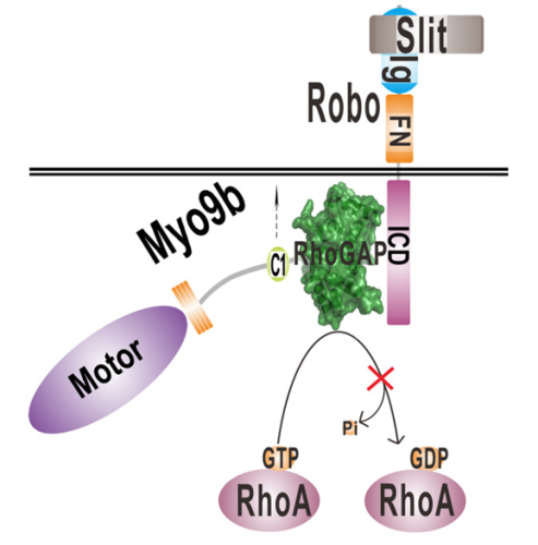 图2. SLIT通过ROBO受体抑制Myo9b RhoGAP对RhoA的活性分子机制模式图