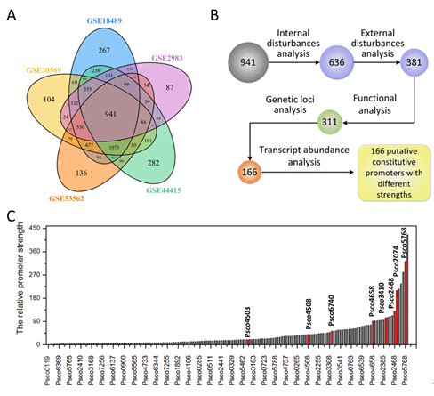为了得到具有不同序列、不同强度特征系列组成型启动子,杨克迁课题组从天蓝色链霉菌不同培养条件下的时序转录组数据出发,经过一系列理性的分析遴选和实验验证,获得了166个不同强度的组成型启动子(图1)。这些启动子将为链霉菌合成生物学研究提供元件支撑。相关工作发表在Microb. Cell Fact.,李珊珊和王俊阳为并列第一作者,研究员杨克迁和助理研究员王为善为并列通讯作者。