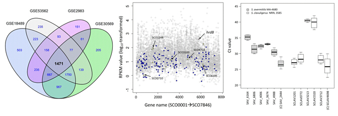 另外,转录水平的相对定量分析是链霉菌基础和应用研究的必要环节。最近有若干文献报道看家sigma因子hrdB 基因的转录水平是生长依赖的,不是理想的内参基因。杨克迁课题组结合不同培养条件下的时序转录组数据和后续的同源分析、內源外源扰动分析、功能分析和转录丰度分析,得到若干内参基因;进一步通过对候选内参基因转录水平的实验和普适性验证,鉴定得到了5个有普适性和不同表达丰度特征的内参基因(图2)。这些内参基因能够满足链霉菌中不同转录强度目的基因的转录本相对定量分析;它们协同使用将会显著提高转录分析的数据质量。相关文章发表在Sci. Rep.,李珊珊和王为善为并列第一作者,杨克迁为通讯作者。
