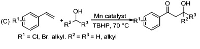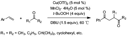 此外,王乃兴课题组还发现了在铜/锰双催化剂下苯乙烯与酮类的高选择性氧化偶联反应。研究发现在锰催化剂协同铜催化剂的条件下反应收率相比于单一铜催化剂下有明显的提高,在双催化剂和叔丁基过氧化氢的存在下,苯乙烯经与酮的C(sp3)-H键官能团化,一步得到1,4-二羰基复杂产物。反应条件温和,区域选择性高。该催化体系应用到不同取代的端基芳香烯烃与酮类化合物且都能够发生该偶联反应。
