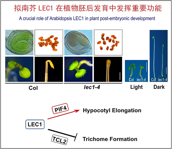 中国科学院华南植物园植物激素调控研究组博士黄铭坤在研究员侯兴亮的指导下,发现拟南芥LEAFY COTYLEDON1(LEC1)在调控植物胚后发育中发挥重要作用。LEC1是植物胚胎发育的关键调控因子,LEC1突变会造成植物多重表型,包括胚胎发育缺陷、下胚轴缩短、异常的子叶形态以及种子萌发率下降等。下胚轴是研究胚后发育的一个普遍模式系统,利用分子生物学手段,他们找到了LEC1的互作因子,bHLH转录因子PIF4蛋白。研究发现,LEC1和PIF4存在直接的相互依赖关系,并且能够共同结合到下胚轴伸长相关基因如IAA19、YUC8的启动子G-box元件上,协同调控下胚轴的伸长。此外,研究也揭示了LEC1通过调控毛状体发育相关基因的表达以及招募转录因子TCL2等来抑制子叶毛状体的发育。这些研究成果明确了LEC1在植物胚后发育过程中的重要角色,同时也增强了对LEC1参与植物发育调控的功能认知。