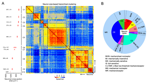 神经元表达的基因多于其它类型的细胞,导致了神经元具有很高的异质性。外周感觉神经元是假单极神经元,负责将外周感觉信号传递到脊髓。以往的研究将初级感觉神经元分为:表达神经肽P物质或降钙素基因相关肽的肽类小细胞、结合植物凝集素B4的非肽类小细胞、表达酪氨酸羟化酶的小细胞和表达神经丝200的大细胞。在啮齿类动物,小细胞通过无髓鞘的C纤维或薄髓的Aδ纤维将外周感觉信号传递到脊髓背角I-II层,而大细胞则通过厚髓的Aβ纤维将外周感觉信号传递到脊髓背角III-V层。通过功能特性还可将初级感觉神经元分为机械感受器、伤害性感受器、热感受器和痒感受器。依据反应类型可将伤害性感受器称为机械热、机械敏感的或机械不敏感的伤害性感受器等。