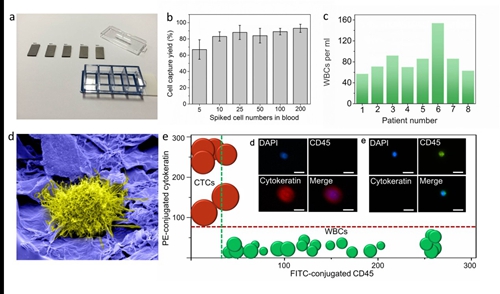 a)所制备的用于临床实验的检测套盒;b)癌细胞在全血实验中的检测结果;c)临床检测中的白细胞背景数据;d)检测片上捕获的循环肿瘤细胞扫描电镜图;e)用于临床检测癌细胞与白细胞的荧光标准图。