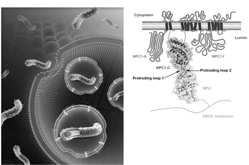 埃博拉病毒囊膜表面糖蛋白在内吞体里经过宿主蛋白酶的酶切处理,变成激活态糖蛋白,暴露出受体结合位点,来与NPC1分子的C结构域发生相互作用,从而启动后续的病毒膜融合过程,实现病毒的感染生活史。