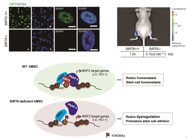 RNA测序结果显示,受转录因子NRF2调控的一系列抗氧化基因在SIRT6缺失的间充质干细胞中均发生了不同程度的转录抑制。其中血红素加氧酶(HO-1)的转录沉默是人间充质干细胞抗氧化能力减弱和加速衰老的重要因素。该研究进一步揭示了SIRT6在人间充质干细胞中作为NRF2的辅助激活因子发挥作用。一方面,SIRT6在HO-1基因启动子区作为脚手架蛋白(Scaffold protein)帮助NRF2招募基础转录机器。另一方面,SIRT6催化H3K56去乙酰化,这在染色质水平使得NRF2转录复合物更加稳固。SIRT6与NRF2协同作用确保了人间充质干细胞中的抗氧化基因得以正常表达,并可据此有效对抗衰老过程所伴随的氧化应激。