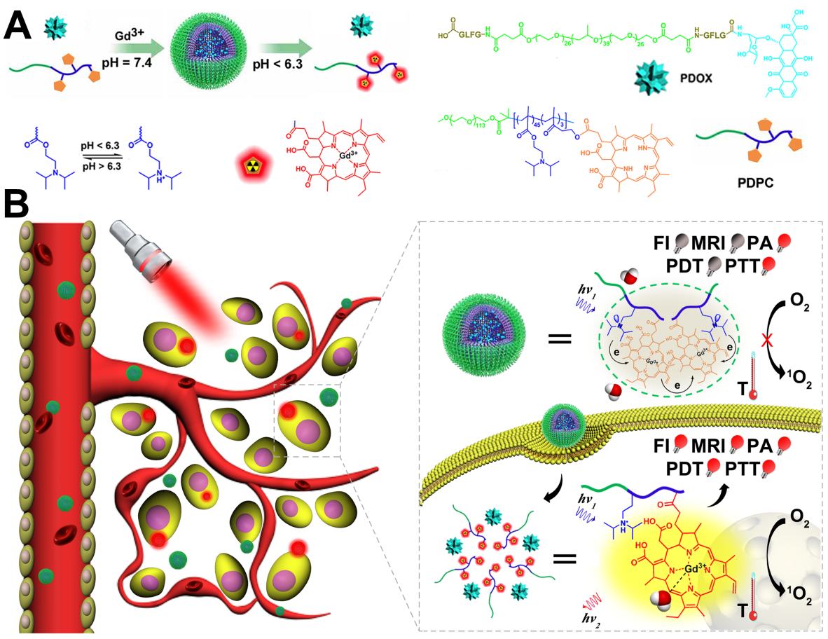 中国科学院上海药物研究所药物制剂研究中心博士研究生王亭亭和王当歌在副研究员于海军和研究员李亚平的指导下,创新性地设计、构建了一种细胞内酸敏感型多功能纳米胶束共输送光敏剂和化疗药物阿霉素前药,初步实现了肿瘤光疗和化疗有机结合克服肿瘤耐药。他们将合成的酸敏感聚合物PDPA、小分子光敏剂Ce6和阿霉素前药通过自组装形成聚合物胶束,发现该纳米胶束在正常生理环境中(pH 7.4)保持稳定和成像“沉默”,在进入肿瘤细胞溶酶体环境后(pH≤6.2)实现酸激活,发挥多模态成像作用并促进化疗药渗透杀伤耐药细胞。该纳米递释系统利用Ce6的特性,实现酸激活的荧光成像和光声成像,配位Gd3+后实现磁成像,实现耐药肿瘤的多模态成像;而Ce6介导的光热、光动力治疗作用可有效增强阿霉素前药的肿瘤组织穿透能力,与化疗作用一起联合杀伤肿瘤耐药细胞,克服肿瘤耐药。实验结果显示:在MCF-7/ADR肿瘤耐药细胞和动物体内,这种新型纳米递药系统能够显著抑制耐药肿瘤生长,同时实现多模态成像和治疗,为有效克服肿瘤耐药提供了新思路。
