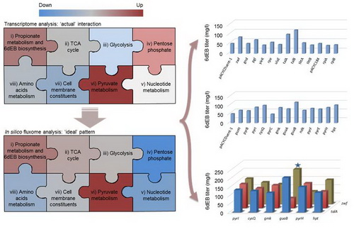 通过结合流量组模拟分析和转录组分析,该研究首次发现了6dEB合成过程中不同代谢模块内流量变化的整体趋势存在巨大差异,并在对这些差异进行系统分析后找到了改善6dEB生物合成的潜在遗传改造靶点。随后,利用反义RNA技术,研究人员首次对大肠杆菌磷酸戊糖途径模块及核苷酸代谢模块上的25个预测靶点进行改造以提高6dEB的合成水平。