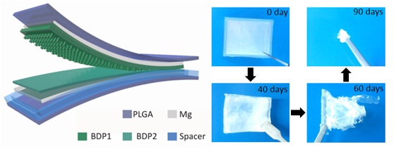 助理研究员郑强基于常见的摩擦电效应和静电感应原理,选用轻质柔软、来源广泛且生物相容性良好的几种生物可降解的高分子材料,开发出该可降解的能源转换装置。该器件受到生物机械力作用时,由两种不同得失电子能力的可降解薄膜材料构成的摩擦层会持续地接触分离,一个材料的表面可以从另一个材料表面得到电子,从而产生持续的电输出。在该研究中,研究人员通过使用不同材料来构建BD-TENG,其电输出能力和降解特性能够根据植入式电子器件具体的电力需求来进行个性化的设计。开发的生物降解纳米发电机(BD-TENG)功率密度达到32.6 mW/m2,使用寿命则在几小时到几年之间可以进行调控。