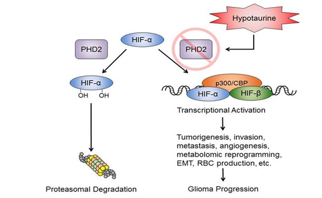PHD2能够在正氧条件下羟基化缺氧诱导因子-1α(HIF-1α),导致后者进入降解途径。PHD2受抑制后导致HIF-1α不降解,而与ß亚基结合入核,启动许多与肿瘤相关基因的表达。上述现象在细胞和分子水平得到了验证。进一步研究发现,胶质瘤细胞摄入亚牛磺酸的氧化产物牛磺酸后,能够抑制细胞内亚牛磺酸合成,达到抑制肿瘤细胞的目的。