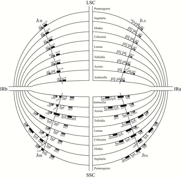 图1 单子叶植物分支早期分化类群的叶绿体基因组结构对比
