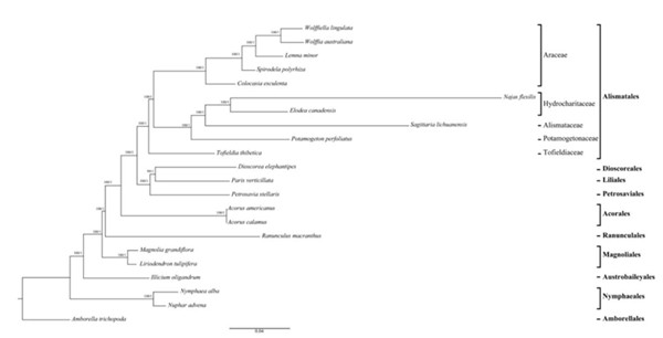 泽泻目(Alismatales)是单子叶植物分支(Monocots)中的一个非常重要的水生类群,并且可能是被子植物最早“下海”的一个祖传系,在淡水和海岸带生态系统中扮演着重要的角色。在当前通行的APG系统中,泽泻目是单子叶植物在其最基部的菖蒲目(Acorales)后随即分化出来的基部类群。十余年来,基于DNA片段所做的分子系统学研究似乎支持天南星科(Araceae)为泽泻目的基部类群,但仍存在诸多疑问。