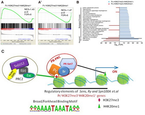 在研究员赵允和魏刚的指导下,博士研究生吕向东和韩志军等采用ChIP-seq和RNA-seq等实验技术方法,结合模式生物果蝇的遗传学优势,通过研究发现逐级招募的PcG蛋白通过调控一系列发育关键因子上的H4K20me1修饰(由甲基转移酶PR-Set7催化)而直接正向调控这一类基因的转录。生物信息学分析也发现PcG蛋白正向调控Pc+H3K27me3+H4K20me1+ 基因的转录,而抑制Pc+H3K27me3+H4K20me1- 基因的转录。更为重要的是,通过实验证明转录因子Broad (Br)特异性结合Pc+H3K27me3+H4K20me1+ 基因而并非Pc+H3K27me3+H4K20me1-基因。该研究阐明了在机体正常发育过程中,Pc通过与PR-Set7以及Br相互结合形成大的复合物从而特异性地正向调控具有Pc+H3K27me3+H4K20me1+ 特征的一类基因转录的新功能和新机制。