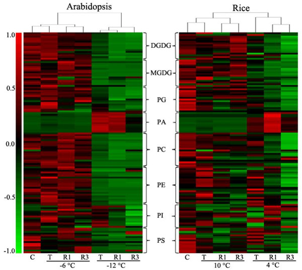 图1 水稻与拟南芥在不同低温处理过程中膜脂变化模式。C表示处理前,T表示处理后的样品,R1,R3分别表示处理后恢复1天和3天后的样品。
