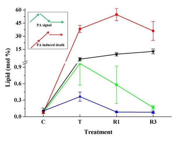 在中国科学院昆明植物研究所研究员李唯奇的指导下,郑国伟和李丽霞合作,通过冻害(−6°C和−12°C)与冷害(10°C和4°C)分别处理拟南芥和水稻,研究了两种植物膜脂在低温诱导的伤害过程中的变化模式。研究发现,拟南芥膜脂的饱和度以及脂肪酸碳链长度均显著低于水稻,这一特性使得拟南芥在低温下很好地保持膜的流动性。拟南芥膜脂组成中糖脂的含量要高于水稻,而高熔点磷脂酰肌醇(PG)分子含量要低于水稻。由于糖脂与PG是叶绿体膜的主要脂类,拟南芥的膜脂组成的特点利于其在低温下绿体膜的完整性的保持。低温处理过程中,磷脂酸(PA)和磷脂酰肌醇(PI)可能在两种植物响应过程中起到信号分子作用。在拟南芥与水稻中,低温诱导的PA含量的增加可能起到双重作用:在非致死低温处理过程中,PA起到信号分子作用,诱导植物的抗性;在致死低温处理过程中,PA起到结构分子作用,其大量积累后不能清除,会导致膜的完整性的破坏。