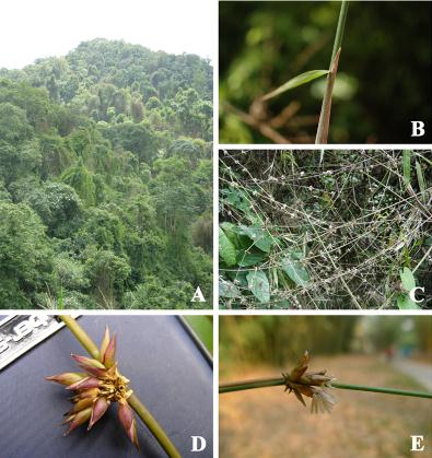 图1 高肩梨籐竹 A. 生境 (12153). B. 秆箨 (12153). C. 花枝 (12154). D–E. 假小穗 (D: 12154, E: C130104)