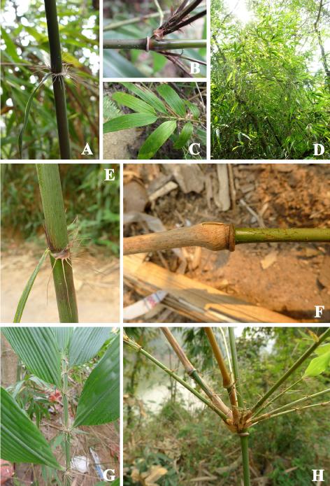 图2 射毛悬竹 A–C. 采自海南的个体. A. 秆箨 (MPF10001). B. 分枝和幼秆 (MPF10001). C. 叶 (MPF10003). D–H. 采自滇南的个体. D. 攀爬于树上的秆 (13012). E. 秆箨 (13001). F. 幼秆 (13001). G. 叶 (13001). H. 分枝 (13001)