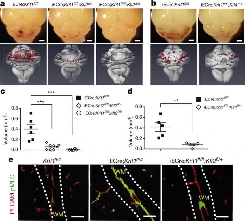 最新研究试图说明这种复合物在海绵状脑血管畸形中的作用机制,使用一种新生小鼠海绵状脑血管畸形模型发现,病变早期血管内皮细胞内MEKK3目标基因Klf2 和 Klf4表达增加,Rho 和 ADAMTS蛋白酶活性增强。这个阶段没有发现血管内皮细胞间质转化现象,SMAD和Wnt信号也没有增加。选择性敲除血管内皮细胞中Map3k3、Klf2 或 Klf4基因,都可以减少海绵状脑血管畸形产生,并增加Rho活性,避免动物死亡。与这些动物实验结果类似,研究还发现人类家族性或散在海绵状脑血管畸形患者病变血管内皮细胞Klf2和Klf4基因表达增加。这一研究说明,MEKK3介导KLF2/4对CCM复合物破坏是海绵状脑血管畸形发生的内在原因。这一信号途径有望成为预防海绵状脑血管畸形治疗靶标。