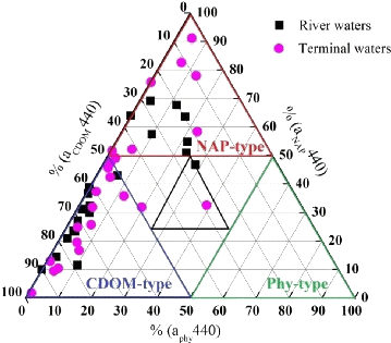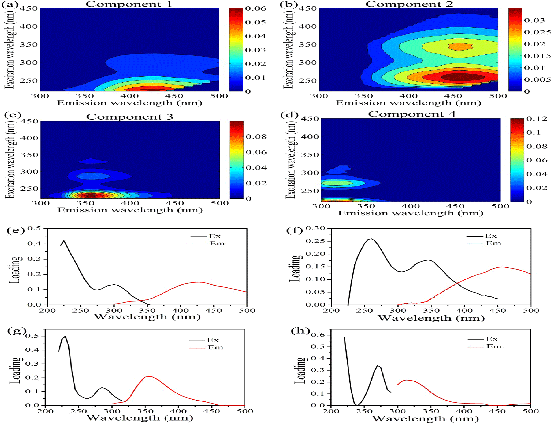 中国科学院东北地理与农业生态研究所水环境遥感学科组成员基于对内蒙古高原重要内陆水体的水质参数和CDOM光吸收的实测数据分析,发现内陆水体中总悬浮物(TSM)、总氮(TN)和电导率(EC)与光学活性物质的光吸收特征具有较强相关性,对CDOM的光吸收特征参数(SUVA254,E250:365,Sr)分析表明东北地区高原河流水体中的CDOM物质较其他地区的淡水河流具有更高的溶解性有机物(DOC)浓度、CDOM光吸收系数和CDOM自生性。此外,课题组还通过三维荧光光谱—平行因子分析(EEM–PARAFAC)技术分析了松嫩平原半干旱区湖泊中CDOM吸收特性及荧光组分的季节变化特征,结果表明水体中CDOM类腐殖质组分与类蛋白组分的荧光强度都有较明显的季节性波动,且CDOM光吸收系数与类腐殖质峰存在高度正相关。