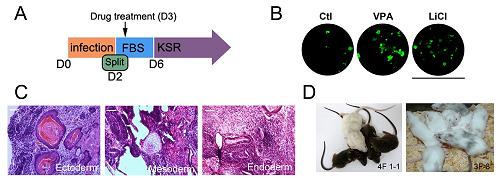 图A为iPS诱导的操作流程;图B为96孔板中四因子诱导后的iPS克隆的图像,LiCl处理大大增加iPS克隆数;图C为iPS克隆形成的畸胎瘤的HE染色,显示iPS细胞可分化为三个胚层的不同组织;图D为iPS克隆产生的嵌合体小鼠,其中左边的嵌合体小鼠生下深色毛发的后代,显示iPS细胞实现了生殖系传递,具有全能性。