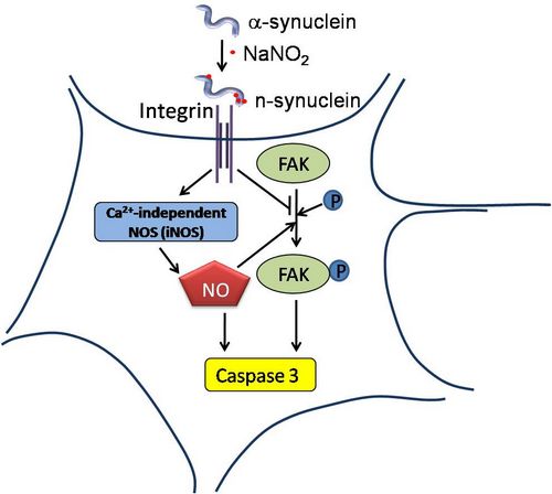 硝基化a-synuclein错误折叠聚积产物导致细胞死亡的分子机制示意图
