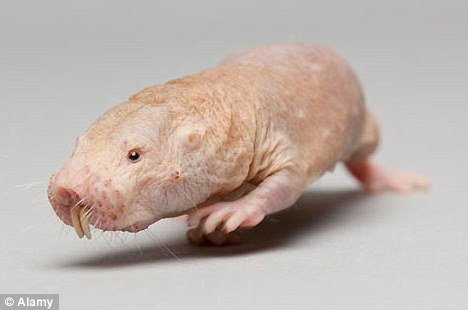 裸鼹鼠很难让人们联想到它是一种长寿动物,它的外形有点儿让人反感,全身光秃秃地不长毛发,且皮肤有皱纹,长着像蠕虫般的尾巴以及像海象一样突出的牙齿,然而它们的身体却非常地健康。