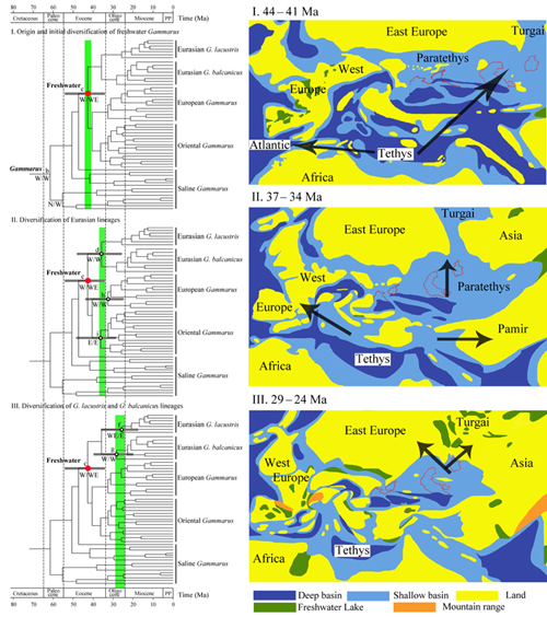 该研究以在北半球淡水和咸水中分布的115种钩虾为研究对象,通过基因序列构建系统树,首次提出淡水钩虾起源于古地中海,并在4300万年前(始新世)由咸水迁移到淡水。原来在咸水中生活的钩虾物种分化缓慢,进入淡水环境后进化速度却经历了早期的快速分化和近期的两次变缓。生物地理学研究证实,钩虾的迁移是由古地质与古气候变化引起的。欧亚板块与印度板块的碰撞导致青藏高原的隆起,切断了古地中海与太平洋、印度洋的联系;同时欧亚板块与非洲板块的碰撞导致欧洲西部陆地面积的增大。随着古地中海的萎缩和欧亚陆地面积的增加,北半球淡水的表面积相应增加,为钩虾迁移至淡水提供了前所未有的生态机遇。其中土尔盖海峡(Turgai)的干涸,更是加快了物种分化进程。但从1400万年前起,随着淡水钩虾物种的增加,物种形成速度减慢。