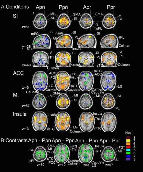 结果发现,在“疼痛刺激”情况下,“自我捏握”所产生的疼痛强度和不舒服程度都明显低于“他人捏握”情况;与此相对应,脑内负责编码痛觉强度和情绪维度的脑区,如初级躯体感觉皮层(SI)和前扣带皮层(ACC)都有明显的去激活。而在“触压”情况下,“自我捏握”产生的挤压程度也明显低于“他人捏握”情况,但情绪维度二者没有显著差异。这与以往研究中“处于主动运动状态的手指能够减轻电刺激的疼痛强度和不舒服程度”相一致。