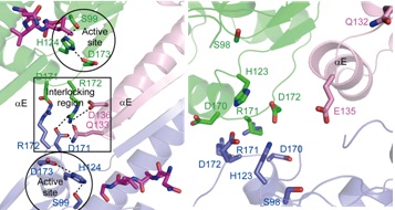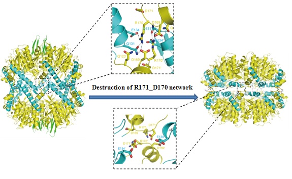 在该研究中,该团队首先成功获得该蛋白酶的两种晶体结构,观察到其两种功能构象:Extended伸展构象和Compressed压缩构象。进而,以计算生物学研究为导向,结合实验手段,发现了ClpP在这两种构象间的动态变化由上下两个七聚体之间的氢键网络所调控,该网络主要由上下两个半球中七对残基R171和D170所组成,可以稳定伸展的构象。最终,该研究阐明了ClpP的动态调控机制:多肽底物进入ClpP空腔后被催化位点降解,催化位点包括三个残基:S98、H124、D172,其中H124与底物、S98以及D172之间都存在较强的氢键网络。降解产物在活性中心的积累造成局部分子间相互作用方式的改变,引起底物与H124之间的氢键断裂,H124发生翻转,继而导致D172的取向发生变化。进而,D172取向的变化传递到R171_D170网络,使得该网络中的相互作用也遭到破坏,Extended伸展构象不能保持稳定,逐渐转变成Compressed压缩构象,释放降解产物出催化腔体。在调控机制研究的基础上,该团队进而开展ClpP化学生物学和抗菌药物发现的研究。首次发现几类活性较好的小分子拮抗剂和抑制剂,相关计算生物学、结构生物学和化学生物学的研究进展顺利。