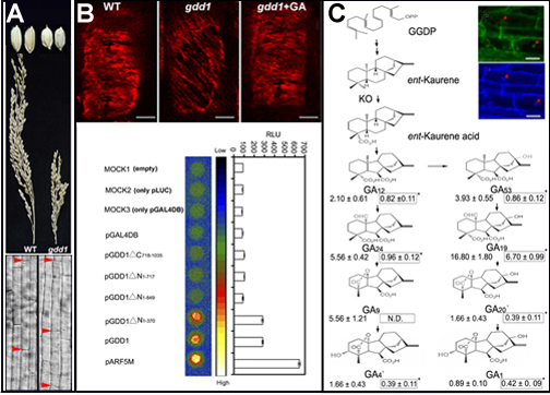 图. GDD1突变引起细胞生长、KO2基因表达以及赤霉素(GA)代谢受阻。A.突变体种子和穗以及细胞生长受阻。B. GA恢复突变体微管排布,GDD1具有转录激活活性。C. GDD1的定位与突变体GA代谢。