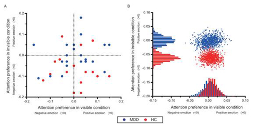 MDD患者和对照组被试的注意偏向。(A)MDD患者(蓝色点)和对照组被试(红色点)的注意偏向的个体结果。横轴表示意识上注意偏向,数值的正、负分别对应正性情绪和负性情绪。纵轴表示意识下注意偏向。(B)对两组被试多次重采样(bootstrap)后的统计分析结果显示,对照组被试的意识下更注意负性情绪(显示于纵轴),而MDD患者则没有出现明显的意识下注意偏向。两的被试群体在这一特征上出现较明显的分离。