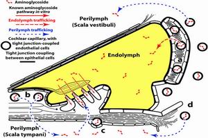 血迷路屏障主动地运输重要的矿物质和营养物---比如离子、氨基酸和葡萄糖---到内耳以便发挥灵敏的听觉功能。斯特格说,这些氨基糖苷类抗生素有可能利用这些营养物运输通道来“偷渡”这些药物到内耳。