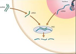 RNAi(RNA interference)即指的是与靶基因同源的双链RNA诱导的特异转录后基因沉默表达的一种现象,RNAi的作用机理是核酸内切酶Dicer将dsRNA(双链RNA)切割成多个具有特定长度和结构的小片段RNA即siRNA,siRNA在细胞内RNA解旋酶的作用下解链成正义链和反义链,然后反义siRNA再与体内一些酶结合形成RNA诱导的沉默复合物(RNA-induced silencing complex,RISC)。RISC与外源性基因表达的mRNA的同源区进行特异性结合并且在结合部位切割mRNA,被切割后的断裂mRNA随即降解。siRNA不仅能引导RISC切割同源单链mRNA,而且可作为引物与靶RNA结合并在RNA聚合酶(RNA-dependent RNA polymerase,RdRP)作用下合成更多新的dsRNA,新合成的dsRNA再由Dicer切割产生大量的次级siRNA,从而使RNAi的作用进一步放大,最终将靶mRNA完全降解。如今RNA干扰技术已经发展成为基因治疗、基因结构功能研究的快速而有效的方法。