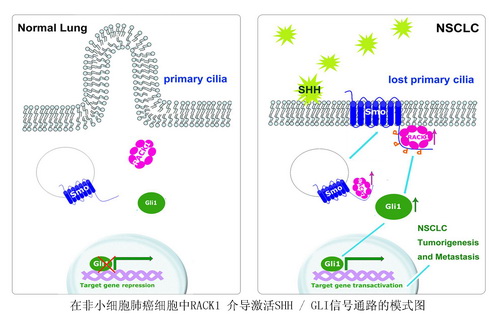 谢东研究员指导的博士生石硕等发现:在绝大多数的非小细胞肺癌中RACK1的表达显著升高,并且它的表达水平与肿瘤的临床和病理参数如肿瘤的分化、分级和转移有显著的相关性。在非小细胞肺癌中RACK1通过与Sonic hedgehog信号通路中的Smoothened结合,活化Smoothened,从而激活Gli1的转录,促进Sonic hedgehog 信号通路的激活。沉默RACK1可抑制Sonic hedgehog信号通路,进而抑制非小细胞肺癌细胞生长和迁移以及体内肿瘤的生长和转移。