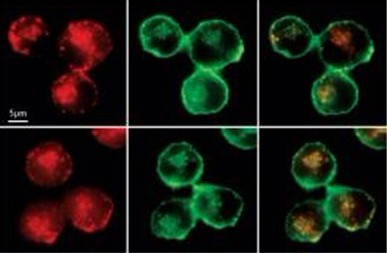 相比于未处理的树突细胞(顶端),用HSP90抑制物根赤壳菌素(radicicol)(底部)处理过的树突细胞倾向于在膜包被的胞内体(绿色;中间)中保留较高水平的抗原卵清蛋白(红色;左边)。胞内体用标记膜蛋白PKH67的染色剂标记。图片来自美国国家科学院。