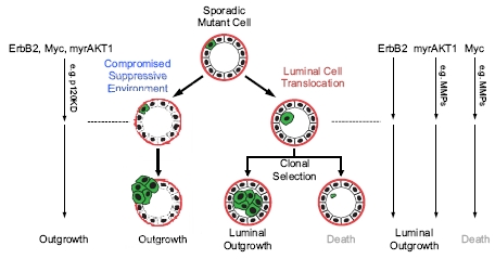 研究人员通过进一步实验发现ERBB2表达影响胞外基质蛋白,从而破坏局部的细胞-基质附着和允许细胞冲破束缚进入腔中不受限制的空间环境。当表达ERBB2的细胞移动到腔中的能力受阻时,它与相邻的细胞呆在一起而不再能够进行增殖。他们也发现只需通过破坏组织中细胞之间的连接,表达包括激活的AKT1在内的之前是良性的其他癌基因的突变细胞能够移动进入腔中并发生增殖。Bras说,“与突变细胞相邻的细胞的地理环境影响着突变的细胞是否能够移动到组织中不同的部分。”